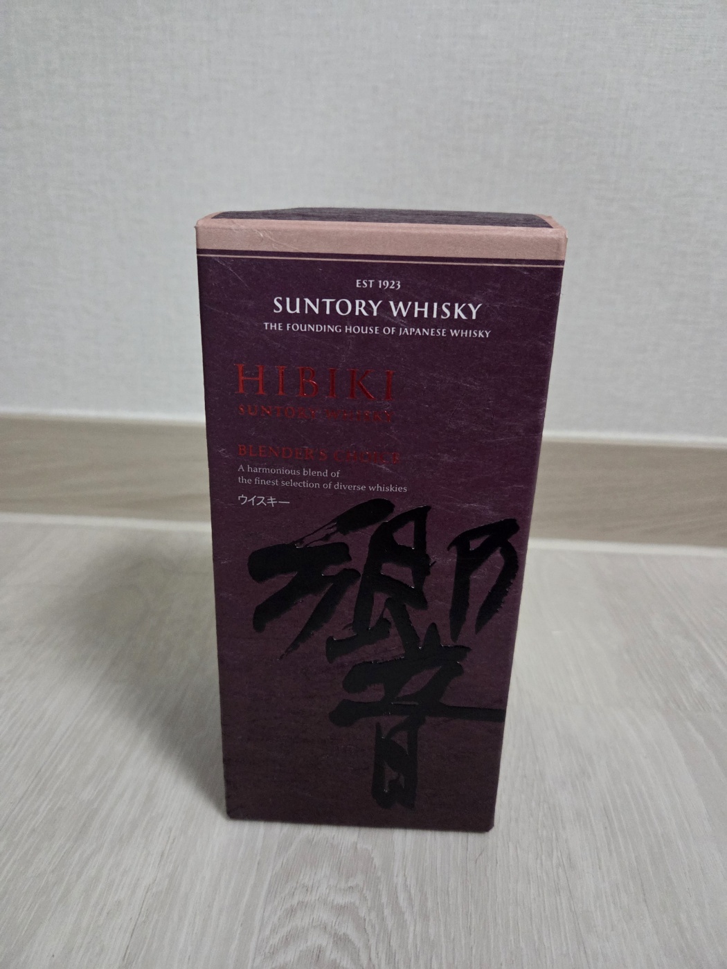 일단 병 디자인부터 보고 가시죠. 히비키 특유의 저 24각 병. 일본의 24절기를 의미한다고 하는데, 언제 봐도 참 예술품처럼 생겼습니다. 거기에 '블렌더스 초이스'라는 이름답게 고급스러운 보라색 한지 라벨이 붙어 있어서, 선물용으로도 진짜 이만한 게 없겠다 싶네요.