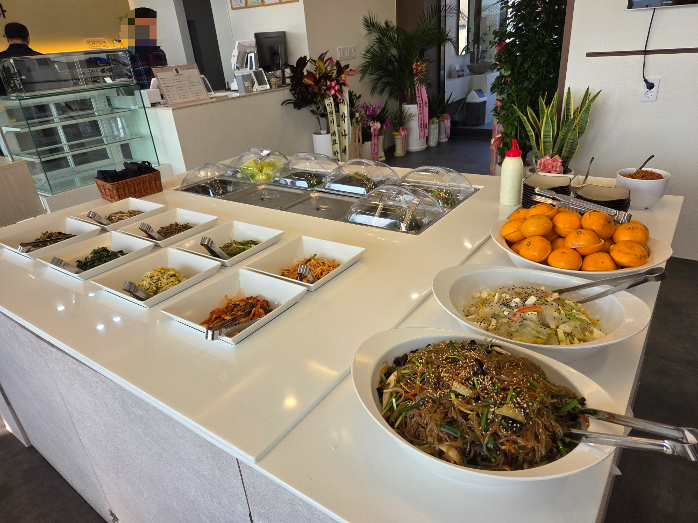 풍담채의 가장 큰 장점 중 하나는 바로 이 셀프바입니다. 각종 쌈 채소는 물론이고 잡채, 샐러드, 나물류가 아주 정갈하게 준비되어 있어요. 후식으로 먹기 좋은 귤까지 놓여 있는 센스에 감탄했습니다.