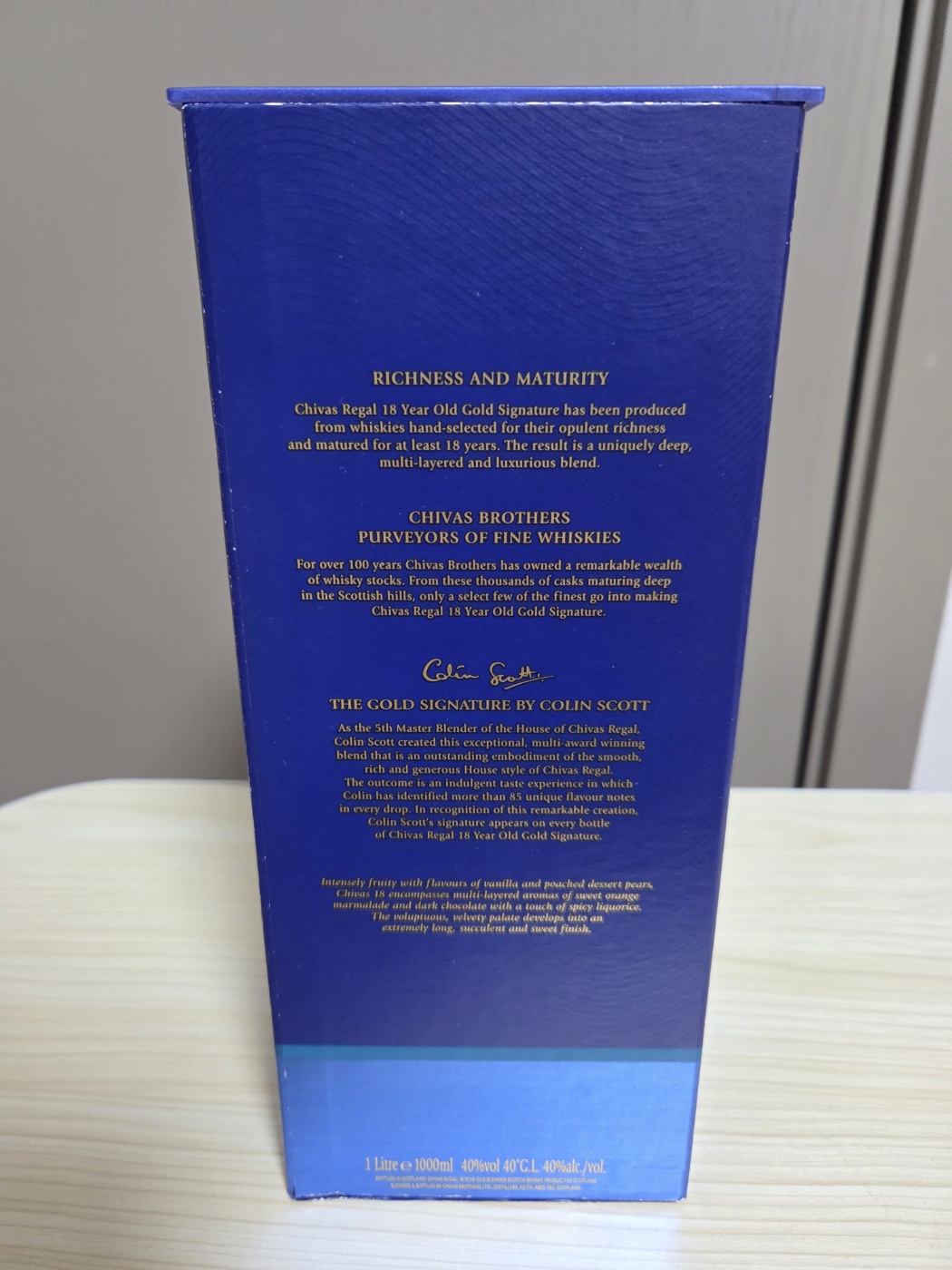 박스 뒷면을 보면 이 위스키가 왜 특별한지 알 수 있습니다. 마스터 블렌더인 콜린 스콧이 선별한 85가지 이상의 독특한 향이 한 방울마다 담겨 있다고 하네요. 최소 18년 이상 숙성된 원액들로 블렌딩 되어 깊고 성숙한 풍미를 자랑합니다.