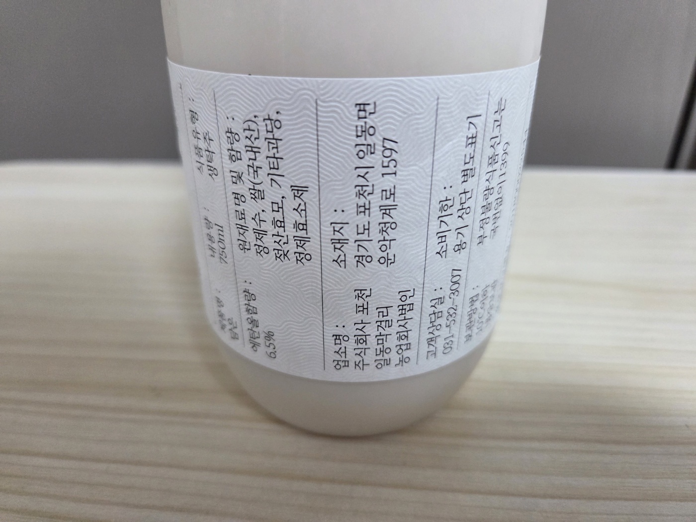 상세 라벨을 살펴보면 알코올 도수는 6.5%이고, 용량은 750ml입니다. 1932년부터 이어져 온 전통 있는 포천 일동막걸리(농업회사법인 일동막걸리)에서 제조한 술이에요. 원재료는 국내산 쌀을 주원료로 하며, 부드러운 맛을 내기 위해 여러 정제 효소들이 사용된 것을 확인할 수 있습니다.